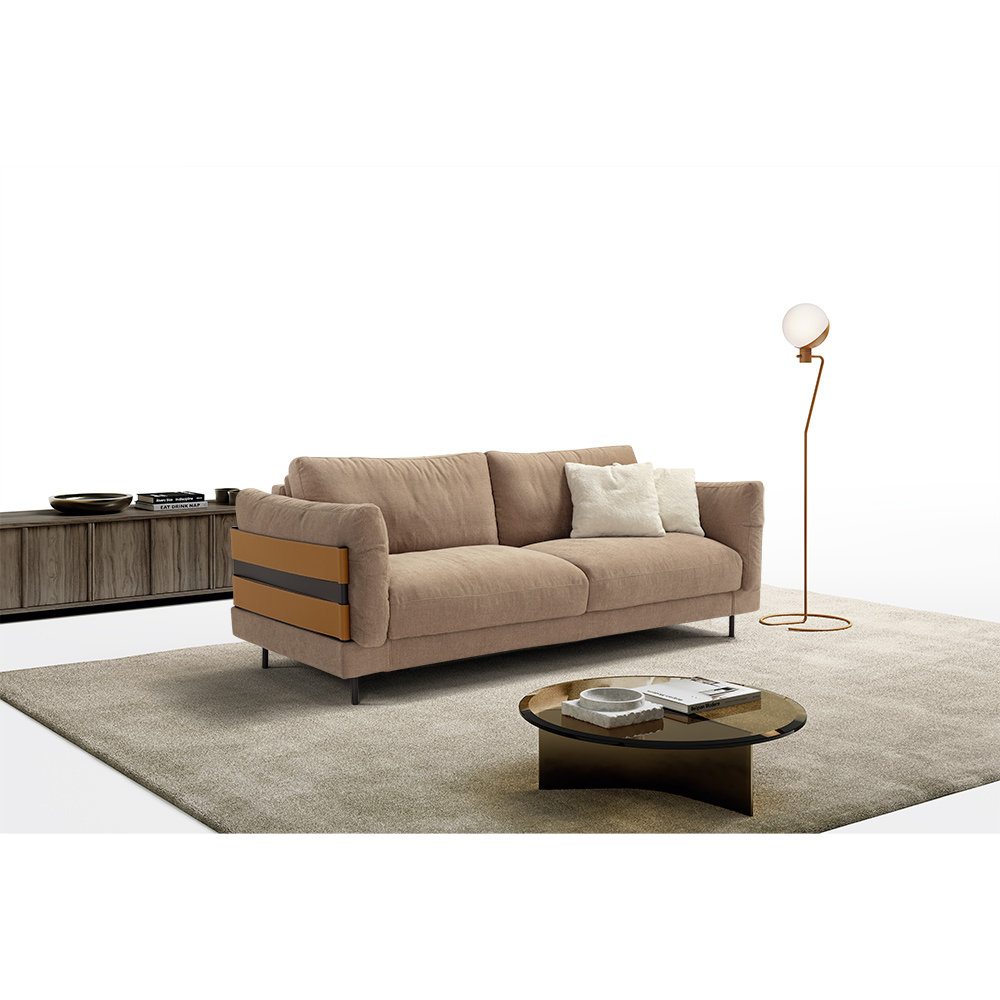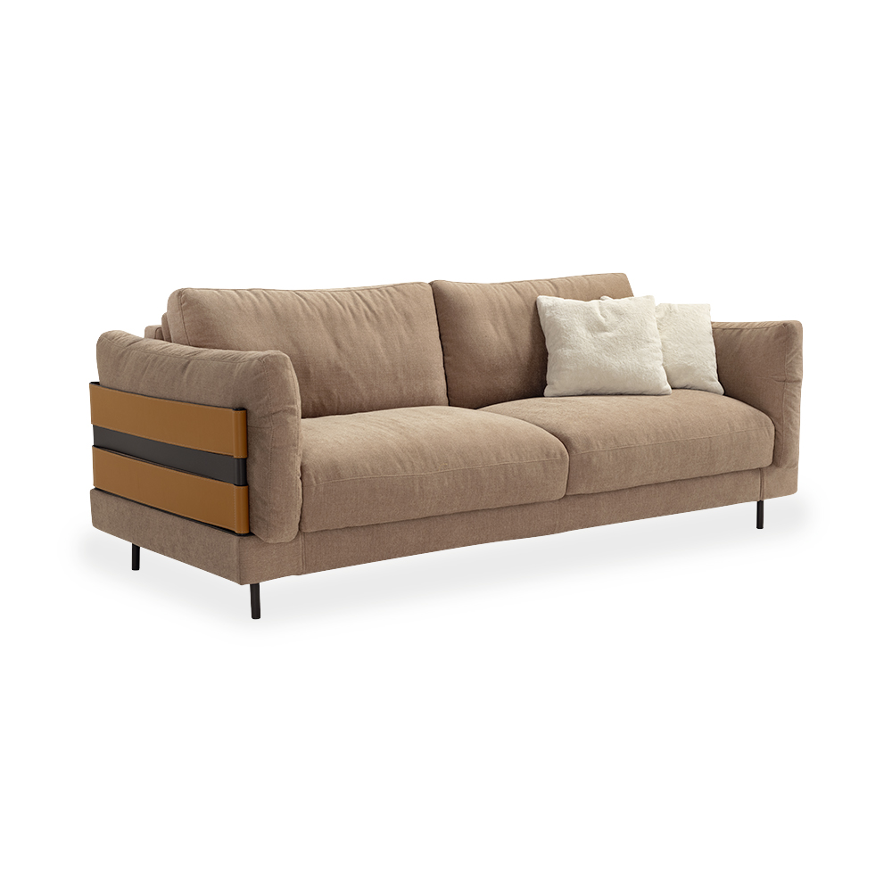 Son élément distinctif réside dans ses accoudoirs garnis de duvet d’oie, soulignés de panneaux latéraux bicolores, qui crée un contraste subtil entre la sobriété du design et la chaleur de la matière. Les pieds métalliques noirs accentuent sa légèreté visuelle et ajoutent une touche moderne supplémentaire.