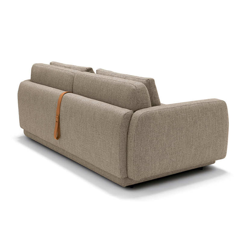 Le dossier, garni de flocons de polyester, offre un confort moelleux et soutenu. Le système Rolling System permet de déployer un lit double sans retirer les coussins du dossier : un simple tirage de la lanière en cuir suffit pour activer la bascule et transformer le canapé en couchage confortable et stable.