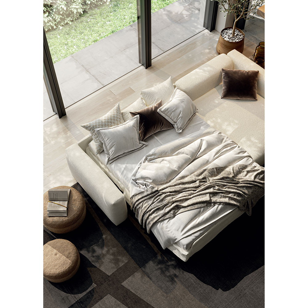 L’assise, large et parfaitement tendue, dessine une ligne horizontale nette qui s’étire d’un accoudoir à l’autre. Sa profondeur maîtrisée invite à une posture détendue, aussi agréable en position assise qu’en mode couchage. Elle repose sur une base pleine, visuellement compacte, qui renforce la sensation de stabilité du canapé convertible. Cette assise est conçue en mousse de polyuréthane indéformable d’une densité de 30 kg/m³, associée à 400 gr/m² de fibre siliconée, garantissant un accueil confortable, un bon maintien et une excellente tenue dans le temps.