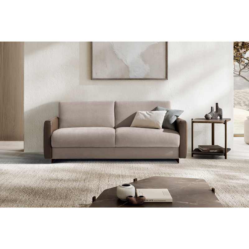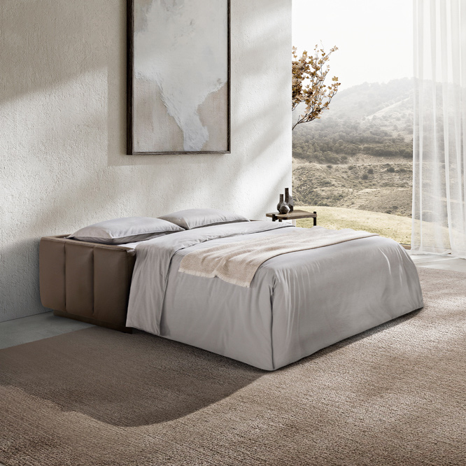 Grâce à son mécanisme Rolling System, la transformation en lit double se fait en un clin d’œil : nul besoin de retirer les coussins, un simple geste sur la lanière en cuir suffit pour déployer un matelas haute résilience de 28 kg/m³. Pratique et fluide, ce système garantit un couchage de qualité, idéal pour un usage quotidien.