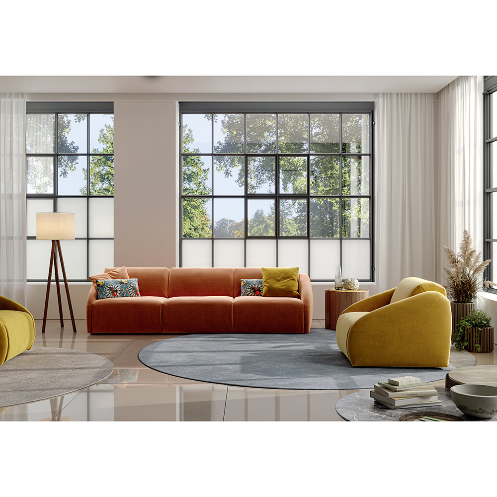 Entièrement déhoussable, le canapé Saint-Lazare combine esthétique et praticité. Cette conception facilite l’entretien tout en offrant la possibilité de faire évoluer le style au fil du temps. Le revêtement, ici mis en valeur par une teinte chaleureuse et contemporaine, souligne le caractère pop du modèle et accentue ses lignes arrondies.