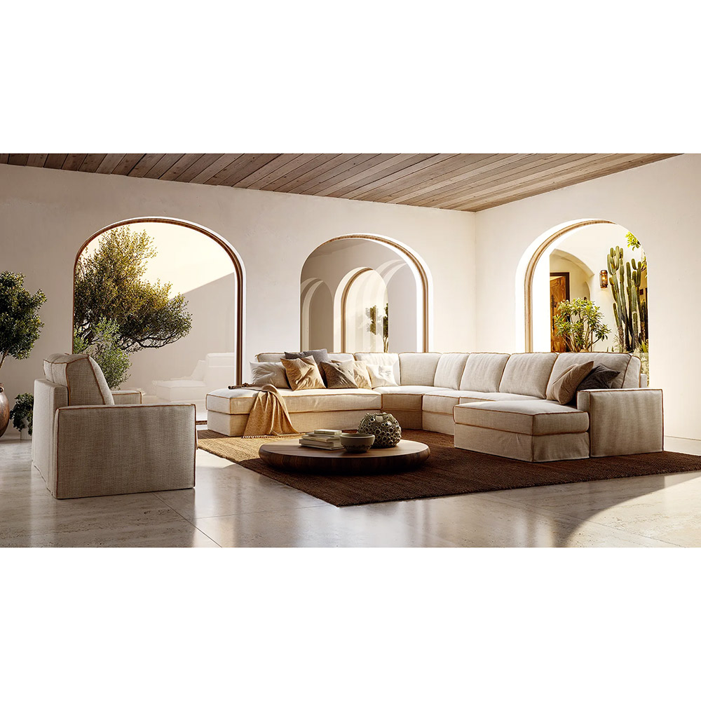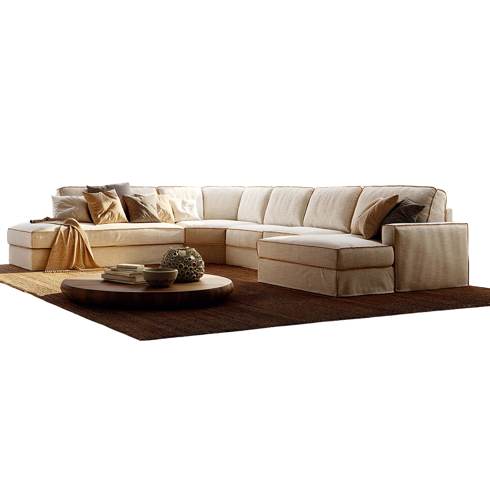 Le revêtement textile, à l’aspect naturel et légèrement texturé, habille l’ensemble avec douceur. Les finitions soignées et les bordures visibles dessinent délicatement les contours des coussins, évoquant un travail de confection précis. Ce traitement apporte du relief à la silhouette tout en conservant une esthétique chaleureuse et décontractée.