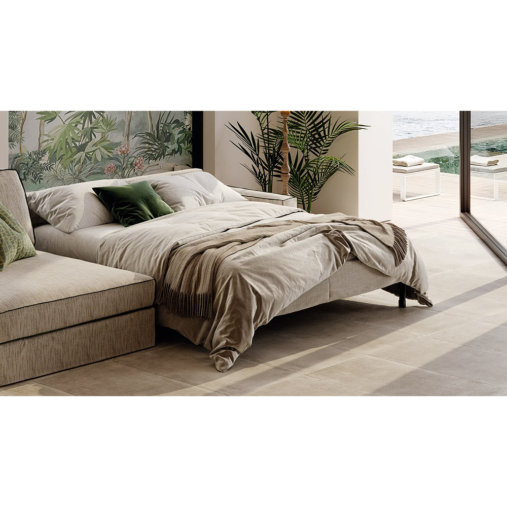 Le canapé d’angle convertible Etretat adopte une configuration en L ample et structurante, pensée pour habiller l’espace avec élégance tout en créant une véritable zone de détente. Sa silhouette horizontale, basse et continue, dessine un volume rassurant, presque architectural, qui ancre naturellement le canapé dans la pièce. Les proportions généreuses sont parfaitement maîtrisées : l’ensemble impose sa présence sans jamais paraître lourd, grâce à une ligne fluide et enveloppante.