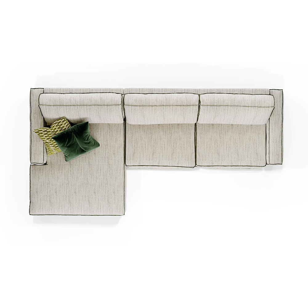 L’assise, large et profonde, se déploie comme une surface homogène composée de modules alignés avec précision. Cette régularité visuelle renforce l’impression de calme et d’équilibre. Conçue en mousse de polyuréthane élastique de 36 kg/m³, elle offre un maintien ferme et durable, idéal pour un usage quotidien. Le confort est enrichi par un rembourrage en Circular Micro Memo Flock, une technologie haut de gamme à micro-flocons de mousse à mémoire de forme qui assure un soutien dynamique, une excellente adaptabilité morphologique et une reprise rapide de la forme initiale.