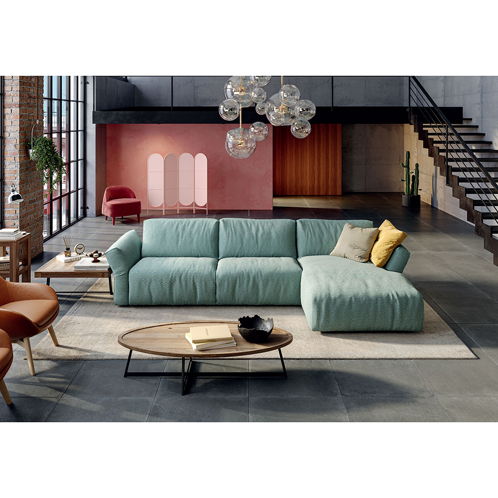 Le tissu bleu-vert texturé confère au modèle un caractère chaleureux et contemporain. La teinte douce s’accorde facilement avec des décors scandinaves, modernes ou naturels, tandis que les coussins décoratifs ajoutent une touche de rythme sans rompre l’harmonie.